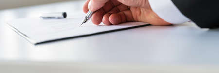 Wide low angle view image of businessman signing a document with silver ink pen.