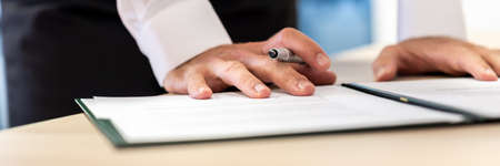 Contract signing concept. Businessman hand with pen over document closeup. banner
