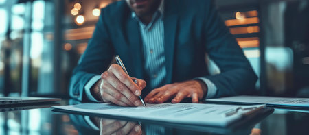 A professional individual carefully signing a contract in a modern office setting. The scene showcases professionalism, responsibility, and attention to detail in a work-related environment.
