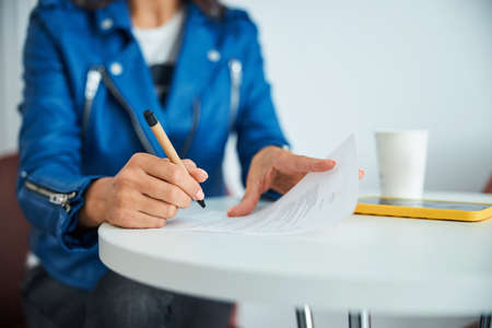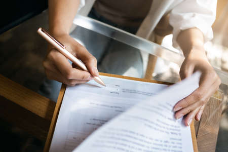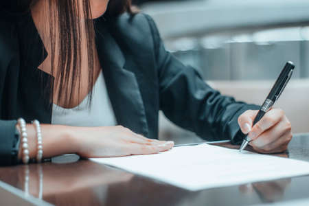 Close up of female hands signing business contract. Concept of female business, online education, professional occupation
