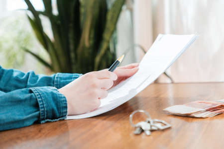 A lawyer draws up a contract for the sale of real estate. Hands, documents, keys and money close-up. The concept of legal services and mortgages.