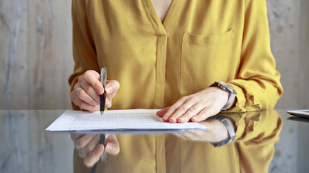 Businesswoman in yellow blouse is signing corporate contract at her office desk. Business people concept