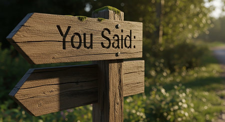 A rustic wooden signpost stands at a junction in a natural setting, bathed in warm sunlight filtering through trees. The sign two weathered wooden planks, each with the words You Said: carved into them, pointing in opposite directions. Moss grows on the of the post, adding to its aged appearance. The suggests a moment of decision, reflection on past words, or the exploration of different paths.