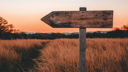 A wooden arrow signpost pointing towards the right, standing in an open field with tall grass and trees at sunset. The background is blurred to emphasize the signpost, which has no text on it. This scene conveys a sense of freedom or directionality, as if showing paths for someone's journey ahead. --chaos 30 --ar 16:9 --v 6.1 Job ID: 62d2fdb3-22b1-4696-abc4-0fb03fd57d9b