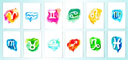 Set of signs of Zodiac icons. Watercolor style icons on white background. Symbols of zodiac horoscope. Vector illustration.