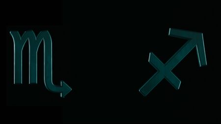 Abstract animation of two 3d astrological Zodiac signs Scorpio and Sagittarius rotating on a dark background. Animation. Horoscope. Part of a Zodiac series.