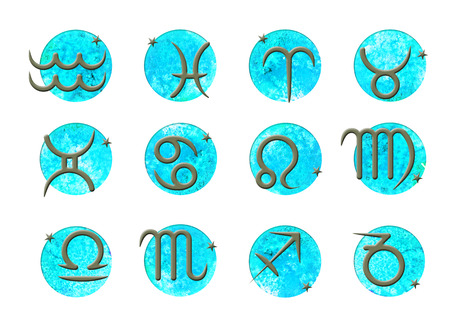 Set of simple stroke zodiac signs on watercolor vector circles background. Bright, colorful round shapes blue. Isolated on white background