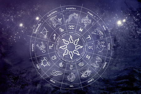 Illustration of zodiac wheel with astrological signs against starry sky in night