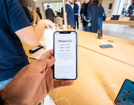 Paris, France - Mar 19 2019: Man POV personal perspective holding iPhone XS inside the new Apple Store Champs-Elysees - showing prices in Euros - French flagship store