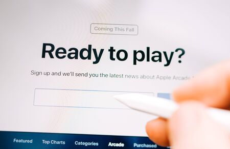Paris, France - Mar 27, 2019: Focus on Apple Arcade features seen on modern Ipad Pro tablet featuring the Ready to Play text new subscription model for over 100 groundbreaking new games