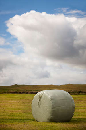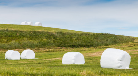 Arrangemetn of Hay bales in white plastic on the green field in Iceland