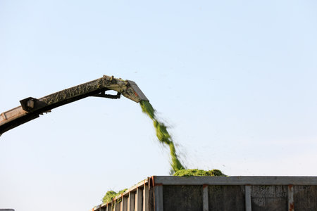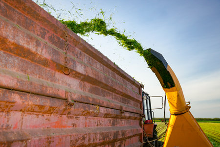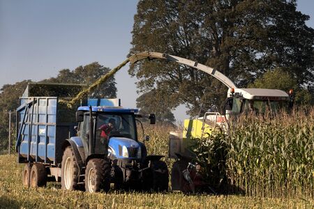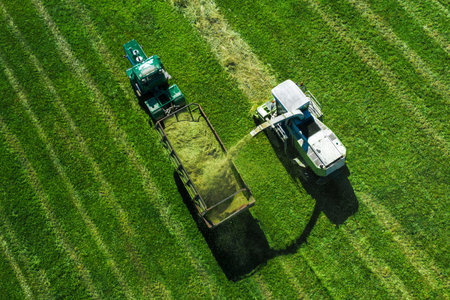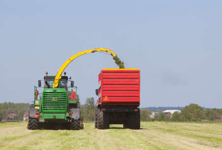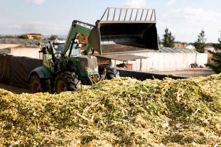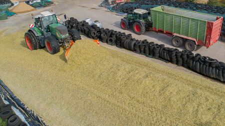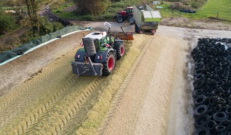 Silage process for stocking feed animals. Tractor with mounted agricultural machine, dragging forage harvester for silage, is depositing fresh harvested green crop in trailer behind.