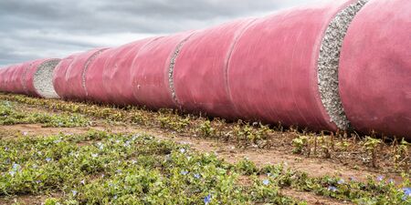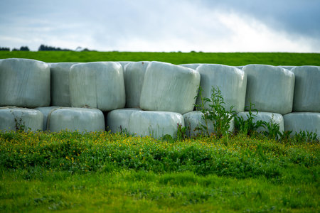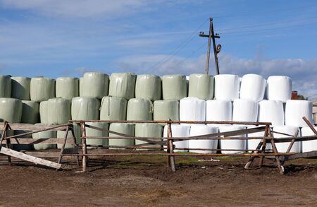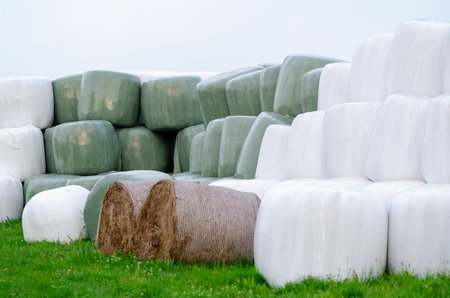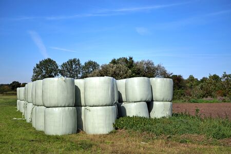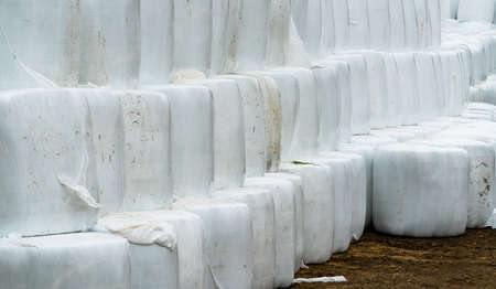 hay straw bales bagged protected plastic covered silage in pile stack row for feed food at harvesting time