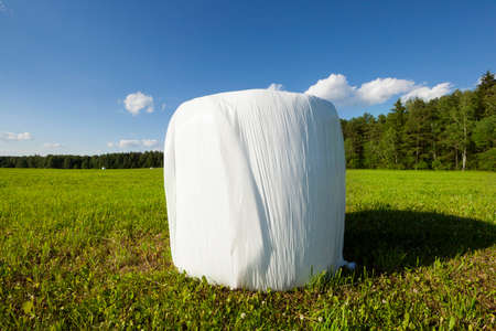 Hay packed in polyethylene PVC packaging lies on the field on green grass on a sunny summer day. The way to preserve the quality of hay is animal feed.