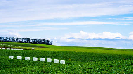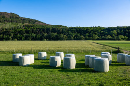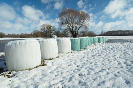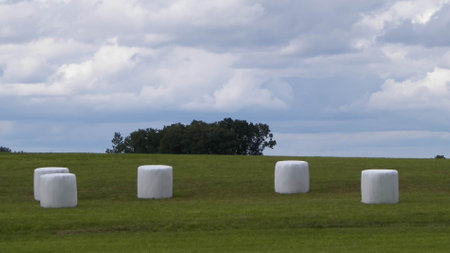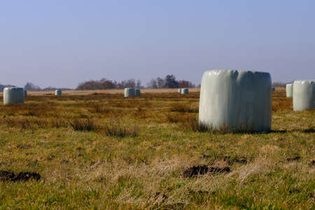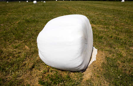 Farm field with hay bales making for livestock and packed in white plastic for storage