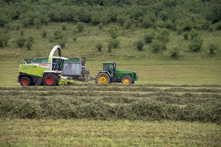 Svitavy, Czech Republic - 20.4.2019: Forage harvest. The John Deere tractor and Claas are harvesting clover for haylage. Agricultural field work