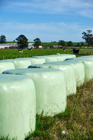 Wrapped hay bales in the field. Taranaki. New Zealand.