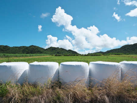 Okinawa,Japan - July 12, 2021: Rolls of harvested dry grass at Ishigaki island, Okinawa, Japan