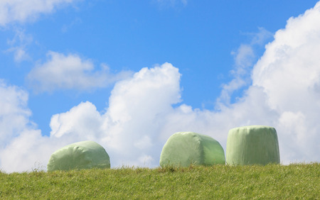 The white plastic wrapped round hay bales (silage) with clear blue sky background, countryside in New Zealand.