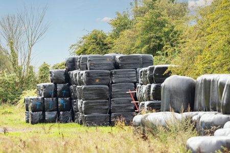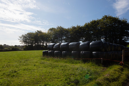 Lucerne Grass Field and stacked up bales of hay wrapped in plastic in summer at sunset, Normandy France