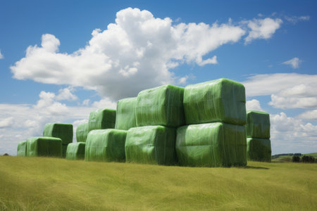 details of huge bales of alfalfa wrapped in nylon to feed cattle, under the sun