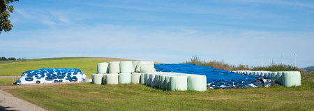 Wrapped straw bales. The bales are stacked in a meadow and covered with a tarpaulin against the rain.