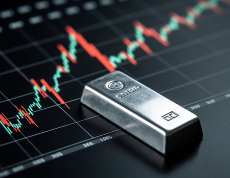 Silver bullion on the background of the stock market graph. Close-up.
