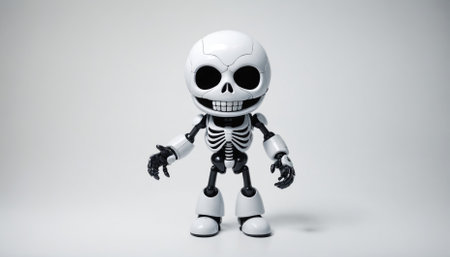 A white skeleton toy stands on a white background, its arms outstretched as if to welcome someone
