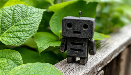 A small, colorful robot toy stands on a table, its blue and colorful body illuminated by warm light. The background is blurred, creating a sense of depth and highlighting the toy.