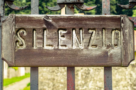Silence sign. Carved wood sign posted on iron gate. Italian language.