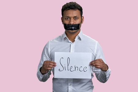 Brown indian man holding sheet of paper with silence word. Isolated on pink background.