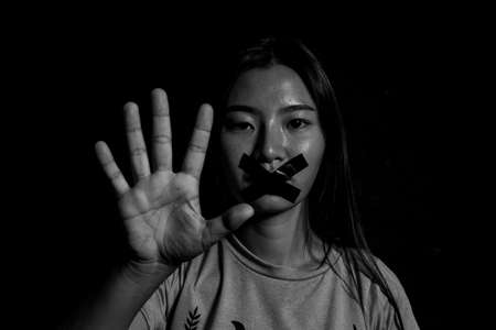 Young woman with taped mouth. Stop violence against women, international women's day