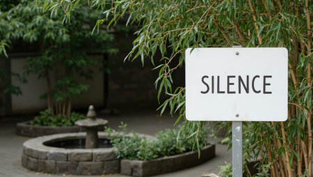 Tranquil meditation garden with Silence sign among bamboo