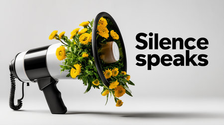 Black megaphone with a bouquet of yellow flowers on a white background.