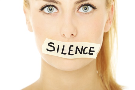 A picture of a female face with a tape on her mouth and a notice silence