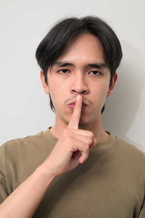 A man holds a finger to his mouth showing a sign of silence.