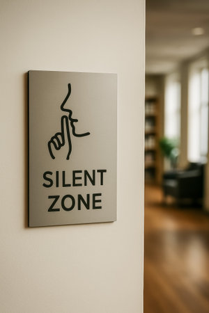 A sleek silent zone sign with a shushing face design placed on a wall indoors