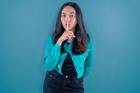 Indonesian Asian woman wearing blue jeans jacket signaling for silence