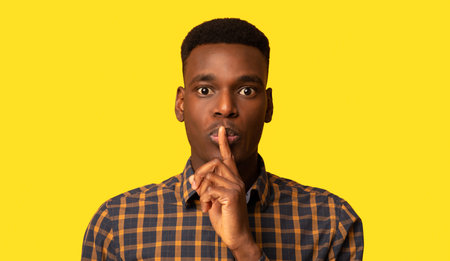 Its A Secret. Young Black Guy Making Silence Gesture Over Yellow Background
