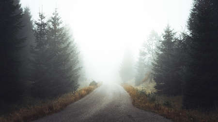 Road inside of deep mountain forest, foggy day, Jizerske hory, Czech republic
