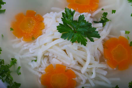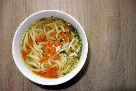 Broth with noodles, carrot and parsley in white bowl on wooden table