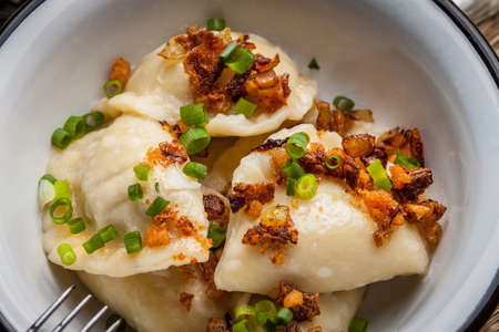 Plate of pierogi or varenyky stuffed filled dumplings with sour cream, bacon and onion, traditional East Europe cuisine meal popular in Poland, Ukraine, Slovakia and Russia, close up, high angle view