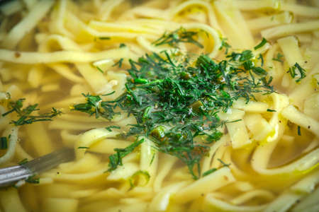 An abstract image of tasty chicken soup with noodles and dill weed.