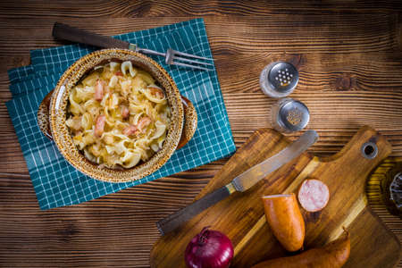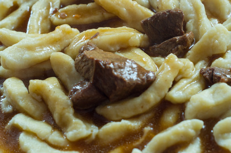 Close-up look on traditional Slovak dish called Halusky served with sheep cheese and fatty meat.