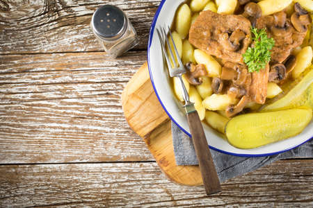 Stewed pork loin with mushrooms, served with Silesian dumplings and salad.
