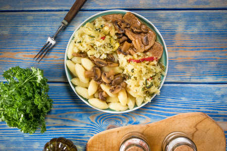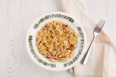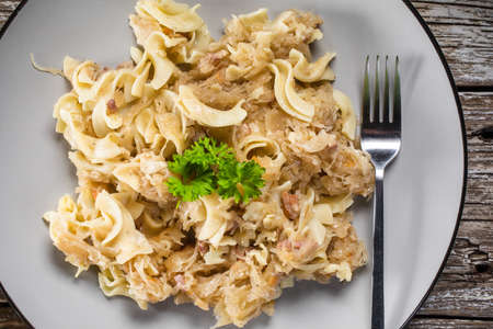 Kapustove halusky known as Strapacky, classic dish in Slovakia, boiled potato dumplings with sour cabbage and onion, topped with fried bacon and fresh chives