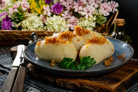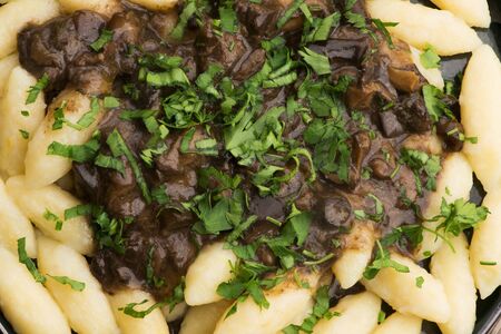 Freshly cooked, Polish traditional potato dumplings serving with mushroom sauce and fresh parsley