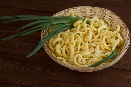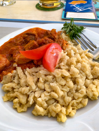 Kasespatzle - Hot spatzle and grated granular cheese , Austrian national cuisine, Traditional assorted dishes, Top view.