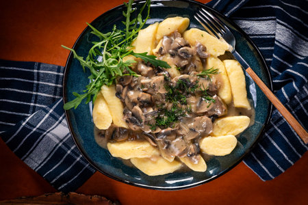 Homemade potato dumplings with mushrooms sauce and arugula. Polish cuisine.
