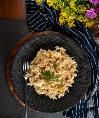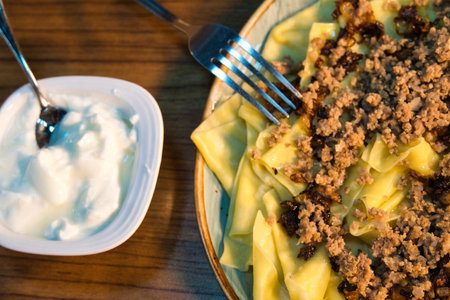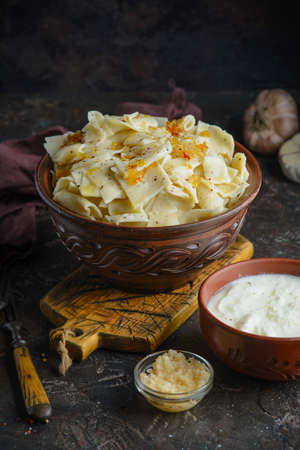 National Armenian Tatar boraki dish. Caucasian traditional pasta served with cream sauce on dark background